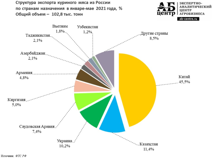 В январе-мае 2021 года ключевыми покупателями российского куриного мяса выступали Китай с объемами в 46,8 тыс. тонн (45,5% в общих поставках по расчетам АБ-Центр), Казахстан - 11,8 тыс. тонн (11,4%) и Украина - 10,4 тыс. тонн (10,2 тыс. тонн).