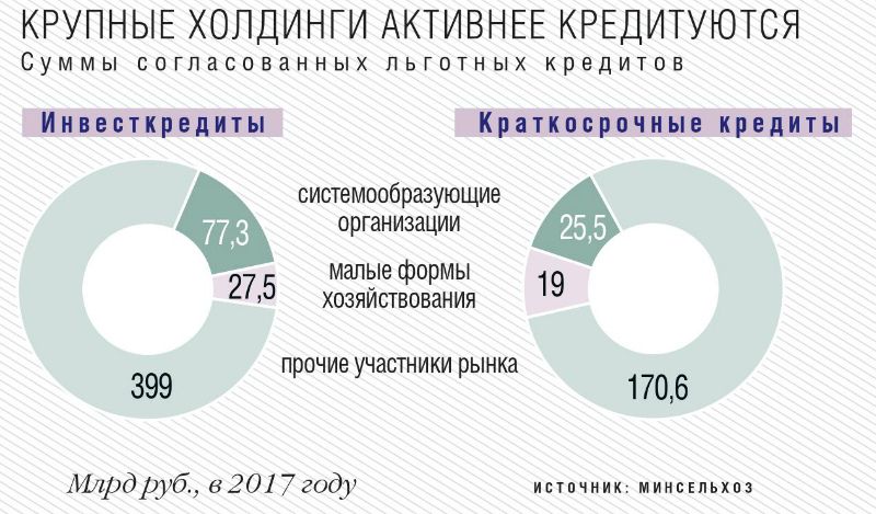 Ни одного льготного краткосрочного кредита не получила и группа «Русагро», правда, у нее большая поддержка по инвестиционным проектам, уточняет гендиректор компании Максим Басов. Хорошо обстоят дела с льготными инвесткредитами и у одного из крупнейших в стране производителей молока — «ЭкоНивы». «Мы одни из тех, кто активно пользуется господдержкой, которую оказывает Минсельхоз, — делится президент холдинга Штефан Дюрр. — Программа возмещения CAPEX и льготные инвесткредиты дают хорошие условия и возможности для толчка в развитии отрасли». Новая система господдержки, скорее, устраивает компанию больше, чем старая, говорит коммерческий директор холдинга Сергей Ляшко. Так, например, льготное кредитование он считает более прозрачным и понятным, чем прежнюю схему субсидирования ставок. «С точки зрения финансового планирования и денежных потоков, безусловно, получение кредита с оплатой процентов с первого дня по льготной ставке более привлекательно, чем их оплата по коммерческой ставке в отсутствие понимания, когда ты получишь свои субсидии», — комментирует он. Однако он обращает внимание и на отрицательные моменты, в том числе сокращение роли регионов при формировании структуры и объема поддержки. В ситуации, когда основным звеном в принятии решения о предоставлении льготного кредита выступают банки, в проигрыше остаются средние и мелкие производители, которые менее привлекательны для них с точки зрения финансовых рисков.