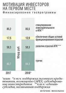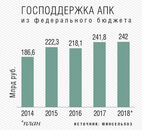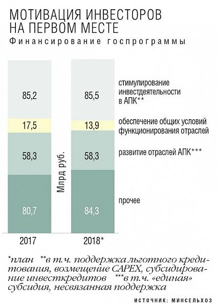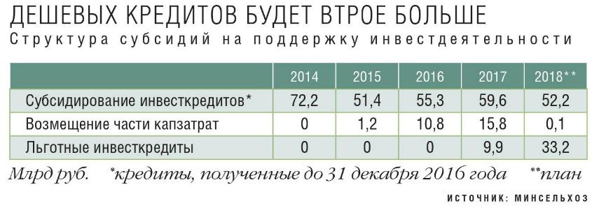 Такая же ситуация произошла с погектарными субсидиями: проект федерального бюджета не предполагал выделение в 2018 году средств на поддержание доходности сельхозпроизводителей, 18,7 млрд руб. перераспределили на льготное кредитование. Позднее в ходе работы над документом Госдума приняла решение направить 11,3 млрд руб. на оказание несвязанной поддержки в растениеводстве и свыше 4,5 млрд руб. — на повышение продуктивности в молочном животноводстве из дополнительно выделенных отрасли 20 млрд руб.