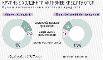 Курские сельхозпроизводители в 2017 году привлекли 9,3 млрд руб. краткосрочных кредитов, а банки получили 540 млн руб. субсидий из 15,4 млрд руб., предусмотренных в целом по России. Сумма полученных инвестиционных кредитов в регионе составила 45,82 млрд руб., субсидии по ним — 910 млн руб. из 9,9 млрд руб. по стране, приводит данные курирующий АПК заместитель главы региона Алексей Золотарев. В первой половине года получить кредитные средства смогли в основном крупные агрохолдинги, признает он, однако после того, как в июле система льготного кредитования была доработана, доступными кредитами воспользовались и малые хозяйства, фермеры, кооперативы. «Мы все только начинаем нарабатывать практику применения новых правил, поэтому неизбежно могут возникнуть некие шероховатости и неудобства», — добавляет чиновник.