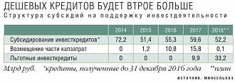 За счет перераспределения средств господдержка льготного кредитования в этом году увеличится почти на 36 млрд руб. до 53,6 млрд руб. В том числе на льготные инвестиционные кредиты будет направлено 33,2 млрд руб. субсидий, при этом государство продолжит субсидировать кредиты, полученные до 2017 года, напомнил Кузин. На эти цели предусмотрено 52,2 млрд руб.