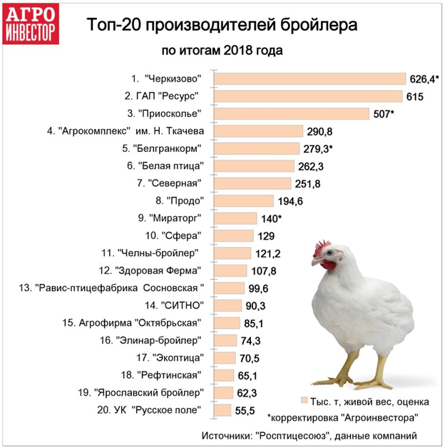Птицефабрика «Серверная», принадлежащая «Чароен Покпанд Фудс», осталась на седьмом месте, объем ее производства не изменился и составил почти 252 тыс. т. Восьмую строчку, как и по результатам 2017 года, занимает группа «Продо», которая увеличила производство примерно со 144 тыс. т почти до 195 тыс. т. На девятую позицию рейтинга «Росптицесоюз» поставил группу «Сфера» (агрохолдинг «Юбилейное») с объемом 129 тыс. т. В прошлом топ-20 она была десятой со 127 тыс. т. Однако, по всей видимости, девятым должен быть «Мираторг». На сайте холдинга говорится, что он выпустил 114 тыс. т бройлера, что примерно соответствует показателю 2017 года. Представитель компании уточнила «Агроинвестору», что речь о готовой продукции в убойном весе. По итогам 2017-го в рейтинге «Росптицесоюза» «Мираторг» был девятым со 140 тыс. т бройлера в живом весе, в списке за 2018 год компания стоит на 11-й строчке с показателем 111,8 тыс. т. Таким образом, «Сфера» должна занимать десятое место, как и в прошлом топе. Сейчас же на десятой позиции находится компания «Челны-бройлер» («Агросила») с показателем 121,2 тыс. т против 119,8 тыс. т в 2017 году. С учетом перестановки «Мираторга» она должна быть 11-й, как и в прошлый раз.