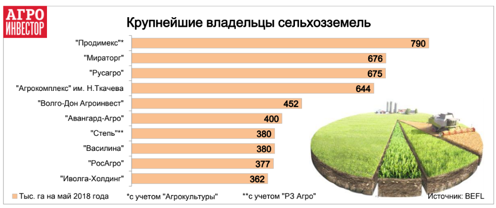 Аудиторско-консалтинговая компания BEFL подготовила ежегодный рейтинг крупнейших владельцев российских сельхозземель по состоянию на 2018 год. Число компаний-участников рейтинга за год выросло с 50 до 55, из них 48 контролируют более 100 тыс. га сельхозугодий, еще семь имеют приблизительно 100 тыс. га и располагаются на условной 49-й строке рейтинга. Общий земельный банк под контролем компаний рейтинга по состоянию на май составил 12,6 млн га, что превышает уровень прошлого года на 600 тыс. га. Несмотря на изменения, на первую пятерку рейтинга, как и годом ранее, приходится 3,2 млн га.