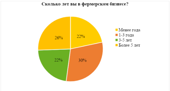 При этом всех респондентов характеризует желание научиться вести бизнес эффективно за счёт новых знаний. Вопрос о стаже в сельском хозяйстве не выявил явный ответ-лидер и разделил диаграмму ответов практически на 4 равные части. Это значит, что ценность знаний понимают как новички, так и опытные фермеры, которые хотят повысить доходность бизнеса.