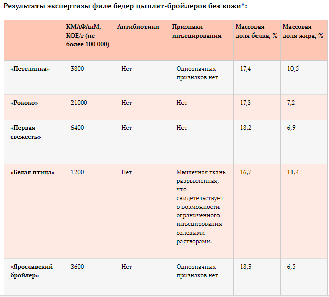 Но на этом эксперты не остановились и решили узнать, как обстоят дела с куриными бедрами без кожи. Поэтому в лаборатории оказались филе бедра пяти брендов: «Петелинка», «Ярославский бройлер», «Рококо», «Первая свежесть», «Белая птица».