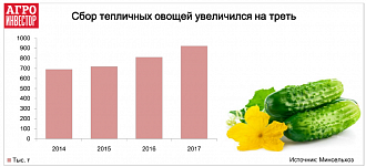 Тепличное овощеводство за прошедшие три года стало одним из самых привлекательных направлений для инвесторов. Производство тепличных овощей в России увеличилось с 690,8 тыс. т в 2014 году до 922,2 тыс. т в 2017-м. Только за прошлый год Минсельхоз отобрал 27 проектов по строительству и модернизации тепличных комплексов общей площадью 231,7 га, возместив инвесторам свыше 6,3 млрд руб. капзатрат. За прошлый год в стране было запущено 251 га тепличных комплексов, общая используемая площадь зимних теплиц увеличилась на 6% до 2,27 тыс. га.