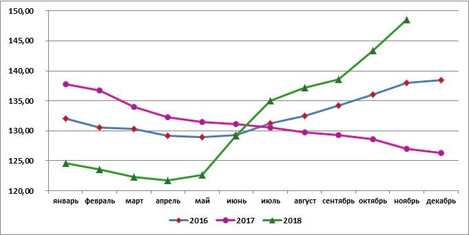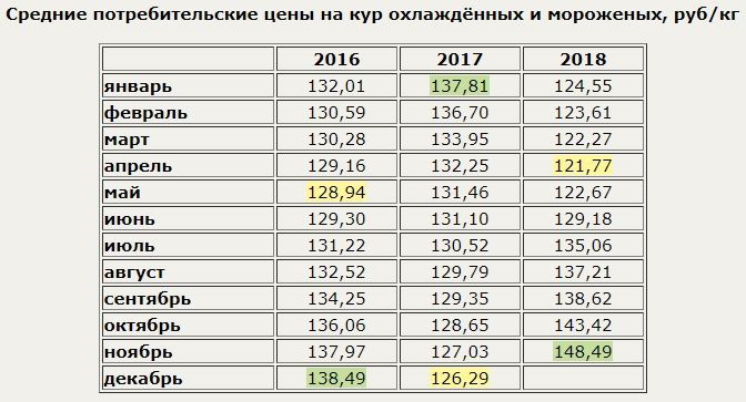 В ноябре 2018 г. куры охлаждённые и мороженые в России стоили в среднем 148,49 руб./кг - это на 3,5% больше, чем в предыдущем месяце, и на 16,9% больше, чем в ноябре 2017 года. С начала года цена данного товара выросла на 19,2%.