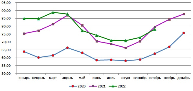 В октябре 2022 г. средняя цена куриных яиц в России составила 78,18 руб./10 шт. - это на 7,3% больше, чем месяцем ранее, и на 1,9% меньше, чем в октябре 2021 года. С начала года цена данного товара снизилась на 7,9%.