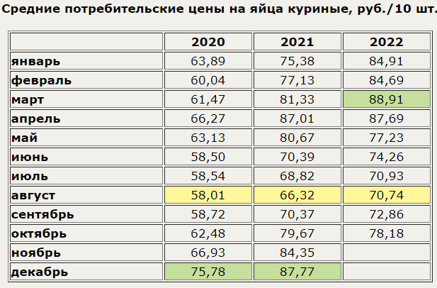 Цена куриных яиц в России в октябре 2022 г. составила в среднем 78,18 руб./10 шт.