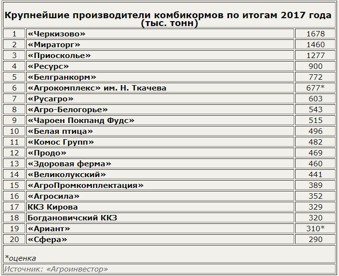№4 «Ресурс» прибавил за год почти 200 тыс. тонн. Авторы рейтинга прогнозируют, что компания будет расти и дальше, так как группа купила у «Приосколья» тамбовскую Инжавинскую птицефабрику вместе с комбикормовыми мощностями (примерно 200 тыс. тонн). Это означает, что при полной загрузке в 2018 году компания может нарастить производство комбикормов до 1 млн тонн и выше.
