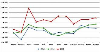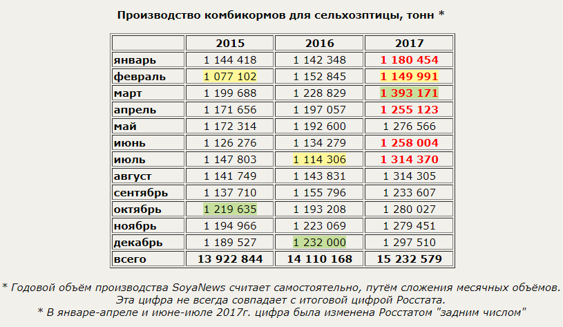В декабре 2017 года в России произведено 1297,5 тыс.тонн комбикормов для птицы - на 1,4% больше, чем в предыдущем месяце, и на 5,3% больше, чем в декабре 2016 года. В 2017 году в стране произведено на 8,0% больше комбикормов для птиц, чем в 2016-м.