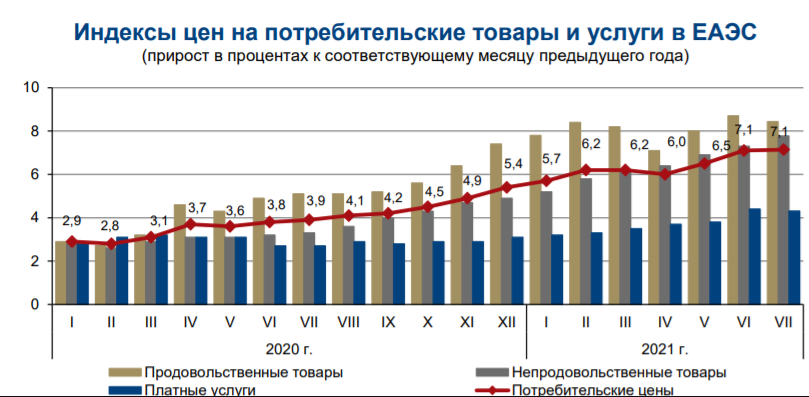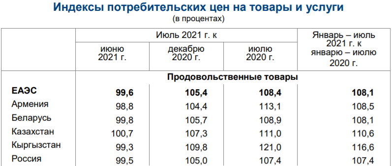 В июле 2021 года по сравнению с декабрем 2020 года выше, чем по ЕАЭС, прирост цен на продовольственные товары зафиксирован в Кыргызстане (на 9,8%), в Казахстане (на 7,3%) и в Беларуси (на 5,7%).