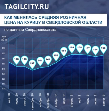 Рост цен на курицу в Свердловской области происходит и без закрытия птицефабрик еще с ноября 2020 года. В начале этого года средняя цена на курицу, поданным Свердловскстата, 152 рубля. За восемь месяцев она поднялась на 9,2% и сейчас составляет 166 рублей.